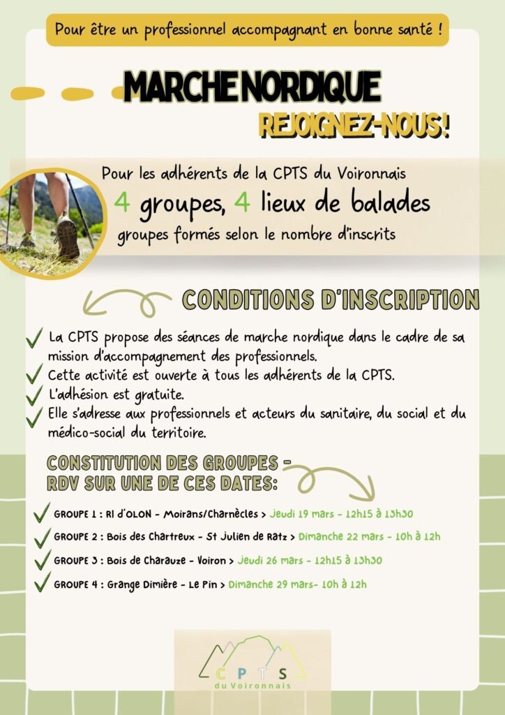 Entre juin et septembre 2025, la CPTS a proposé à ses adhérents des séances de marche nordique en groupe. Accompagnés d’un coach en santé et préparateur physique, ces groupes s’inscrivent dans un programme de 5 séances se déroulant entre Juin et Septembre.
